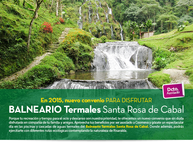 En 2015, nuevo convenio para disfrutar Porque tu recreación y tiempo para el ocio y descanso son nuestra prioridad, te ofrecemos un nuevo convenio que sin duda disfrutarás en compañía de tu familia y amigos. Aprovecha tus beneficios por ser asociado a Coomeva y gózate un espectacular día en las piscinas y cascadas de aguas termales del Balneario Termales Santa Rosa de Cabal. Donde además, podrás ejercitarte con diferentes rutas ecológicas contemplando la naturaleza de Risaralda.